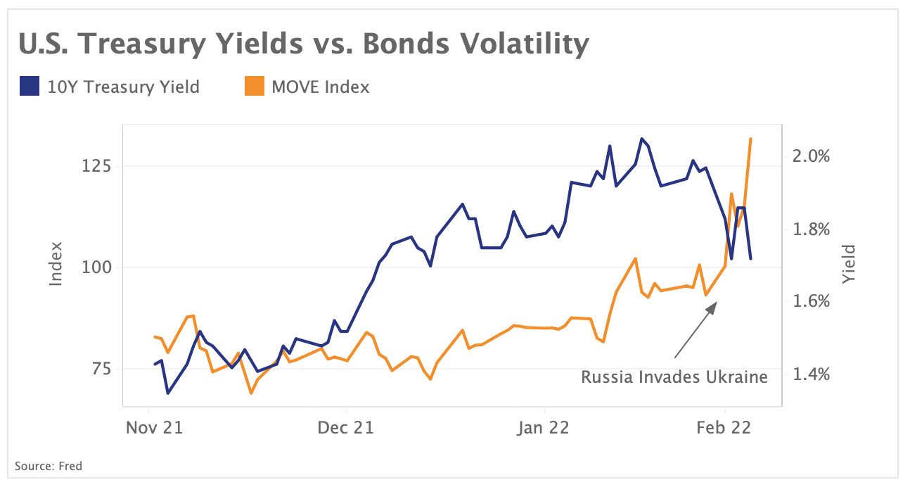 Die Rohstoffpreise sind in der vergangenen Woche aufgrund von Befürchtungen über Versorgungsunterbrechungen in die Höhe geschnellt. So stieg der Ölpreis um mehr als 20%, obwohl sich mehrere Länder auf die Freigabe strategischer Reserven zur Stützung des Marktes geeinigt hatten. Dies hat die Unsicherheit über die Straffungszyklen der globalen Zentralbanken geschürt, da sich Angebotsunterbrechungen sowohl negativ auf das Wachstum auswirken als auch die Inflation anheizen könnten. Oben ist die implizite Volatilität für US-Treasuries (MOVE-Index) zusammen mit der Rendite 10-jähriger US-Treasuries dargestellt. Die implizite Volatilität ist die Erwartung des Optionsmarktes für kurzfristige Kursbewegungen und wird häufig als Indikator für die Angst der Anleger verwendet. Wir beobachten, dass die Volatilität von Anleihen in der vergangenen Woche auf den höchsten Stand seit dem Zusammenbruch des Marktes im März 2020 gestiegen ist. Die Anleiherenditen, die sich invers zu den Kursen bewegen, sind seit dem Einmarsch Russlands in der Ukraine um fast 30 Basispunkte gesunken, da die Anleger nach sicheren Häfen suchten und eine mögliche Wachstumsverlangsamung erwarteten.