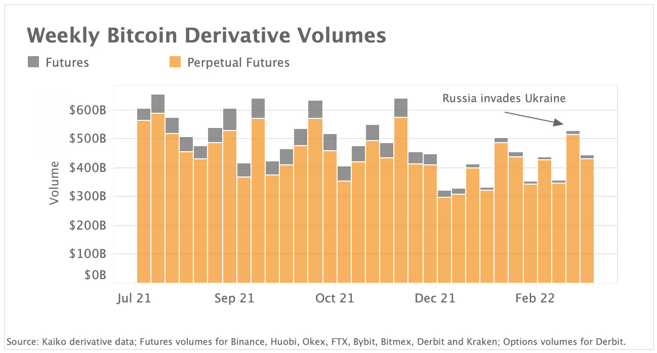 Trotz des historischen 18% Anstiegs von Bitcoin am 27. und 28. Februar blieben die Derivatezuflüsse in der vergangenen Woche insgesamt gering. Die wöchentlichen Volumina von Bitcoin-Futures und Perpetual Futures stiegen nach Russlands Einmarsch in der Ukraine am 24. Februar leicht an und erreichten mit 516 Mrd. Dollar den höchsten Stand seit dem Omikron-Crash im Dezember. Dennoch sank das Volumen in der letzten Woche um 16% auf 430 Mrd. Dollar, obwohl Gerüchte über einen Short Squeeze zum Anstieg der letzten Woche beigetragen hatten. Dies deutet darauf hin, dass die Nachfrage auf den Spotmärkten für den Anstieg von Bitcoin auf über 44'000 Dollar verantwortlich gewesen sein könnte und dass der Einfluss der Derivatemärkte nicht so stark war.