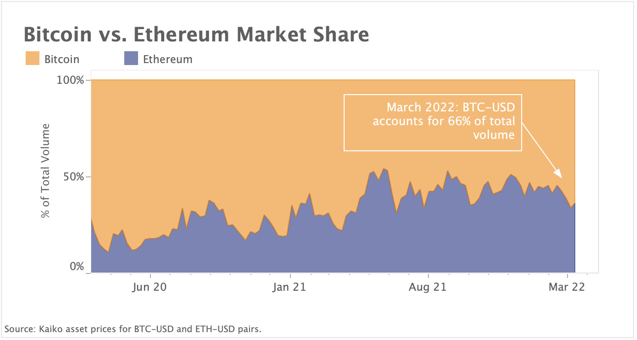 Ein beliebter Massstab für das Verständnis der Marktstruktur ist die Betrachtung der Dominanz von Bitcoin im Vergleich zu Ethereum. Die Idee ist, dass in Hausse-Märkten der Marktanteil von Ethereum relativ zu Bitcoin steigt, da Händler in Altcoins und alternative Netzwerke investieren. In unsicheren Zeiten schichten Händler ihre Mittel wieder in Bitcoin um, welcher als "sicherer Hafen" für Kryptowährungen gilt. Seit 2020 ist das Handelsvolumen für Ethereum im Vergleich zu Bitcoin inmitten des grössten Bullenmarktes in der Geschichte der Kryptowährungen stark angestiegen. Doch im letzten Monat ist Bitcoins Anteil am Gesamtvolumen auf 66% gestiegen, den höchsten Stand seit fast einem Jahr.