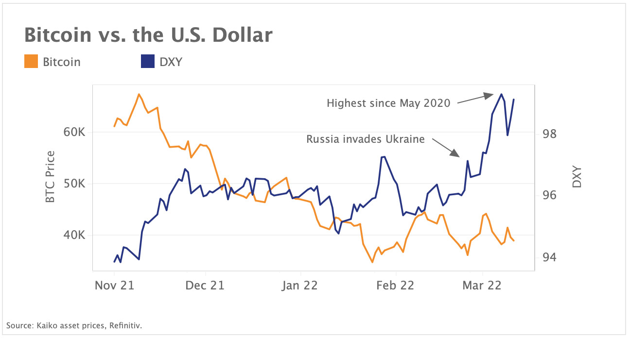 Die weltweite Nachfrage nach Dollar-Liquidität bleibt stark, nachdem die jüngsten Friedensgespräche zwischen Russland und der Ukraine kaum Fortschritte gemacht haben. Der US-Dollar-Index (DXY), welcher die Performance des Greenback im Vergleich zu einem Korb von Fremdwährungen misst, legte die dritte Woche in Folge zu. Auch die hohen US-Inflationsdaten für Februar stützten den Dollar und bestätigten die Erwartung der Märkte, dass die US-Notenbank bei ihrer Sitzung in dieser Woche die Zinsen anheben wird, obwohl die Sorgen über die globalen Wachstumsaussichten zunehmen. Die obige Grafik zeigt den DXY im Vergleich zum Bitcoin-Kurs und verdeutlicht, dass die beiden Währungen seit Jahresbeginn unterschiedlichen Trends folgen, wobei BTC in einer engen Spanne gehandelt wird, während der DXY steigt.
