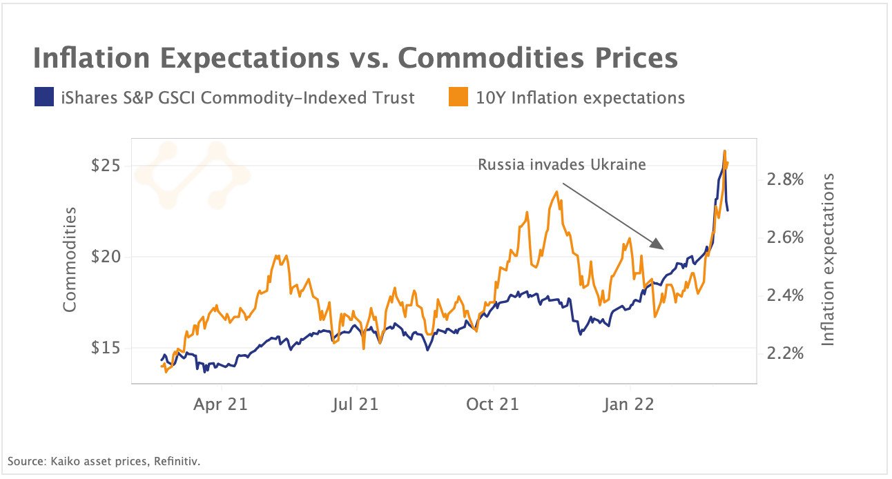 Die Inflationserwartungen in den USA erreichten in der vergangenen Woche den höchsten Stand seit 2003, was durch die steigenden Rohstoffpreise begünstigt wurde. Oben sehen Sie die 10-Jahres-Inflationserwartungen in den USA zusammen mit dem iShares S&P GSCI Commodity-Index Trust (GSG). Der GSG bildet eine breite Palette von Rohstoff-Futures ab, darunter Energie, Edelmetalle und Agrarmärkte. Wir beobachten, dass Rohstoffe nach dem Ausbruch des Krieges zwischen Russland und der Ukraine - beides wichtige Rohstoffexporteure - aufgrund wachsender Befürchtungen über Versorgungsunterbrechungen in Verbindung mit niedrigen globalen Lagerbeständen stark gestiegen sind. Auch die Volatilität hat zugenommen, da die Rohstoffmärkte durch Nachschussforderungen in Aufruhr geraten sind, weil die Händler die Folgen des Konflikts nicht einpreisen konnten. In der vergangenen Woche hat die Londoner Metallbörse (LME) den Nickelhandel eingestellt, nachdem der Preis des Industriemetalls nach einem massiven Short Squeeze innerhalb von zwei Tagen um über 250% gestiegen war.