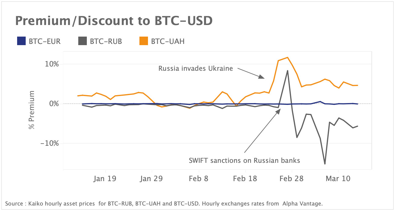 Bitcoin (BTC) wird auf den Märkten für ukrainische Griwna (UAH) weiterhin mit einem Aufschlag gehandelt, während auf den Märkten für russische Rubel (RUB) ein starker Abschlag zu verzeichnen ist. Die Prämie (oder der Abschlag) für den Kauf von Bitcoin mit einer Fiat-Währung wird anhand der Differenz zwischen dem BTC-Preis auf den lokalen Märkten (umgerechnet in US-Dollar unter Verwendung von Fiat-Wechselkursen) und dem Bitcoin-Preis auf den USD-Märkten berechnet. Der starke Abschlag, der auf den russischen Märkten zu beobachten ist, könnte das Ergebnis eines starken Verkaufsdrucks sein, da die Russen versuchen, ihre Kryptowährungen wegen der Gefahr von Sanktionen zu liquidieren. Zentralisierte Krypto-Börsen haben sich bisher an die offiziellen Sanktionen gegen Russland gehalten, indem sie Zahlungen von sanktionierten russischen Banken gestoppt und Konten eingeschränkt haben.