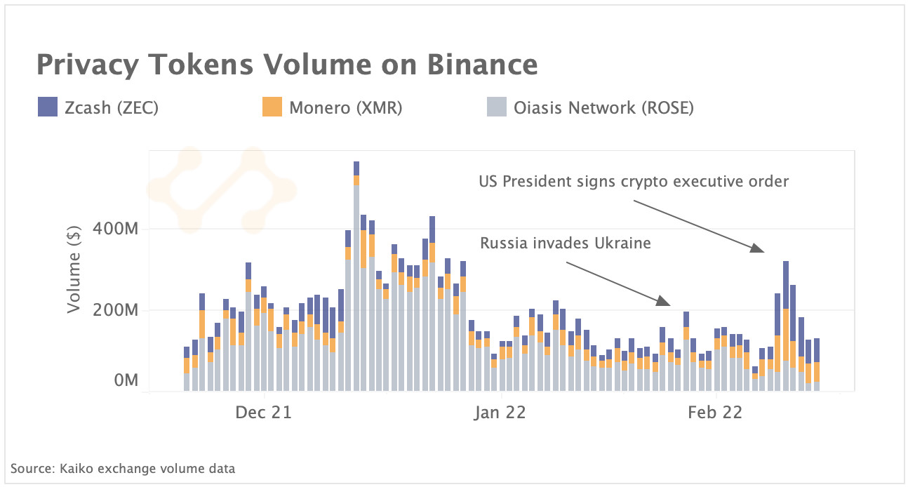 In der vergangenen Woche verzeichneten Privacy Tokens - Kryptowährungen mit Anonymitätsfunktionen - zweistellige Renditen und einen Anstieg des Handelsvolumens. Die Händler erwarteten einen Anstieg der Nachfrage, nachdem die USA ihre Krypto-Regulierungsbemühungen verstärkt hatten. Die drei grössten Privacy-Token nach Marktkapitalisierung - Monero (XMR), Zcash (ZEC) und der ROSE-Token von Oasis Network - verzeichneten auf Binance einen Anstieg des Handelsvolumens um das Dreifache auf 245 Mio. US-Dollar, den höchsten Stand seit Januar. Der Anstieg kam, nachdem der US-Präsident eine lang erwartete Durchführungsverordnung unterzeichnete, welche die US-Behörden dazu verpflichtet, die Vorteile und Risiken digitaler Vermögenswerte zu bewerten. ZEC und XRM haben seit dem Einmarsch Russlands in die Ukraine 51% bzw. 42% zugelegt. Es ist jedoch nach wie vor unwahrscheinlich, dass diese Token zur Umgehung von Sanktionen verwendet werden. Der Anstieg wird wahrscheinlich durch Spekulationen angeheizt.