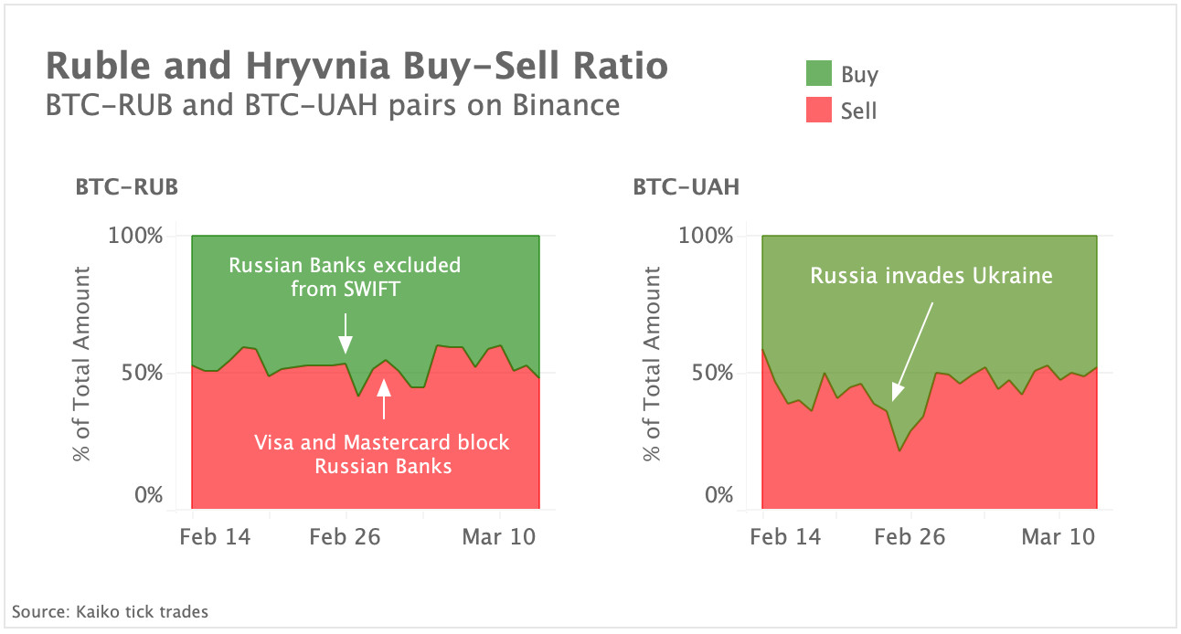 Der einfachste Weg, die Stimmung der Händler zu verstehen, ist die Betrachtung des Kauf-Verkaufs-Verhältnisses, das mit Hilfe der Tick-Level-Handelsdaten von Kaiko berechnet wird. Bei der Untersuchung dieser Kennzahl für die auf ukrainische Griwna und russische Rubel lautenden Bitcoin-Märkte stellen wir mehrere interessante Trends fest. Unmittelbar nach der Invasion stieg das Kaufvolumen für die BTC-UAH-Märkte von Binance auf 79% an, was darauf hindeutet, dass die Händler inmitten der massiven finanziellen Unsicherheit tatsächlich in Kryptowährungen strömten. Auf den russischen Märkten ist der Trend wesentlich gedämpfter, da die Kaufvolumina nur kurzzeitig die Verkaufsvolumina übersteigen.