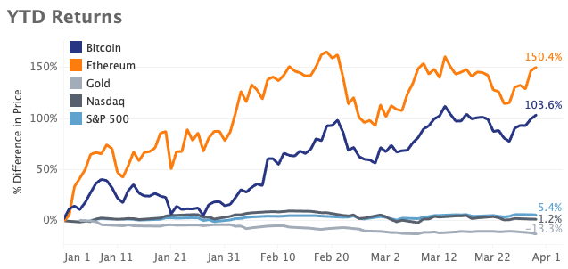 In der Zwischenzeit schloss Bitcoin das erste Quartal mit einem Plus von 103% (YTD) ab und Ethereum ist um 150% angestiegen, was zeigt, dass die Kryptomärkte immer noch die Anlageklasse mit der besten Performance sind.