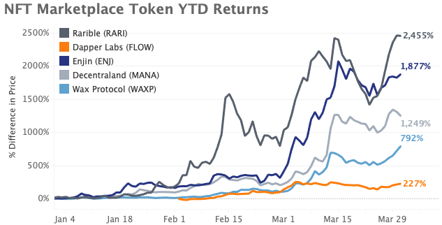 Während NFTs selbst zu immer exzessiveren Preisen verkauft wurden, haben Token von NFT-Projekten gut von der Manie profitiert. Der Token des Marktplatzes Rarible - eine Plattform, die die Erstellung und den Verkauf von digitalen Sammlerstücken ermöglicht - ist seit dem 1. Januar um 2'455 % angestiegen. Der Token von Decentraland - eine virtuelle Welt, in der Spieler NFTs kaufen können - ist um 1'249% angestiegen. Diese Token haben nicht nur Funktionen wie Governance, Utility und Belohnungen, sondern dienen auch als Massstab für die Stimmung rund um die NFT-Industrie.