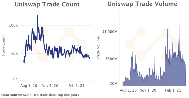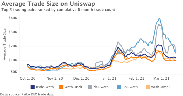 Normalerweise korrespondiert ein Anstieg des Volumens eng mit einem Anstieg der Anzahl der Trades, aber bei Uniswap sehen wir eine Divergenz in diesem Trend. Tatsächlich ist einfach die durchschnittliche Handelsgrösse angestiegen: Sie liegt jetzt zwischen $10-$30k pro Handel, was im Vergleich zu zentralisierten Börsen enorm ist.