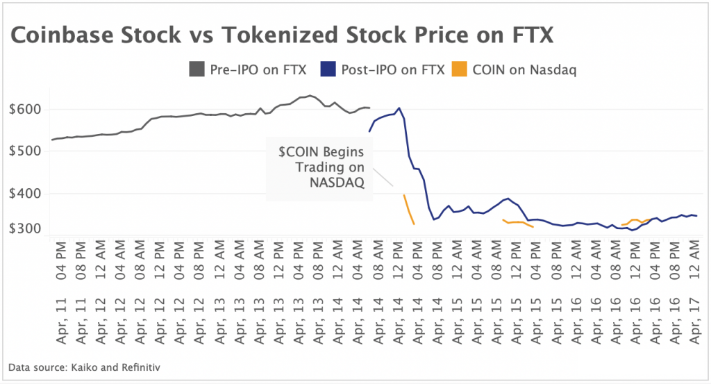 Binance hat letzte Woche Wellen geschlagen, als die Krypto-Börse den tokenisierten Aktienhandel für Tesla und Coinbase einführte. Allerdings haben andere Börsen wie FTX und Bittrex tokenisierte Aktien seit Monaten gelistet. Binance bietet noch keine Marktdaten für ihre tokenisierten Instrumente, aber FTX's pre-und post-IPO Coinbase Kontrakte bieten einen interessanten Vergleich mit Preisdaten der Nasdaq. FTX ermöglicht den Handel mit tokenisierten Aktien rund um die Uhr, während Coinbase nur acht Stunden pro Tag an der Nasdaq gehandelt wird.