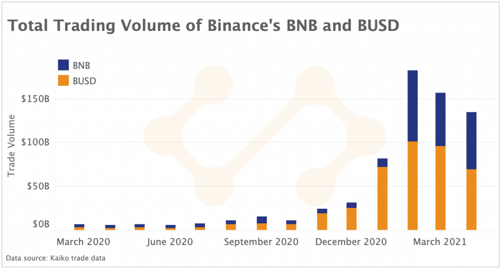 Der Erfolg von Coinbase hat sich auf andere zentralisierte Börsen ausgewirkt, deren Token in der vergangenen Woche erhebliche Preisanstiege verzeichneten. Vor allem der BNB-Token von Binance erreichte in den Tagen vor dem Debüt von Coinbase ein neues Allzeithoch. Binance ist eine von mehreren Börsen, die ihre eigenen Krypto-Vermögenswerte entwickelt haben, um innerhalb ihrer Ökosysteme zu handeln. Doch im Gegensatz zu den meisten anderen Börsen-Token haben Binance Coin (BNB) und der Binance Stablecoin BUSD einen exponentiellen Anstieg der Nutzung im vergangenen Jahr gesehen. Wenn man sich das Gesamthandelsvolumen für jedes Krypto-Asset ansieht (berechnet durch die Summe aller Währungspaare, die BNB oder BUSD entweder als Basis- oder Kurs-Asset enthalten), können wir einen bemerkenswerten Anstieg beobachten.