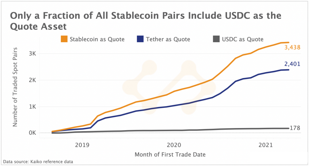 Stablecoins sind gerade der letzte Schrei in der Kryptowelt, da reale Anwendungsfälle immer greifbarer werden. Allerdings geschieht die überwiegende Mehrheit aller Stablecoin-Aktivitäten immer noch auf zentralisierten Börsen. Oben haben wir die Anzahl der gesamten Spot-Handels-Paare in Kaikos Sammlung dargestellt, die einen Stablecoin als Kurswert, Tether als Kurswert und USDC als Kurswert enthalten.
