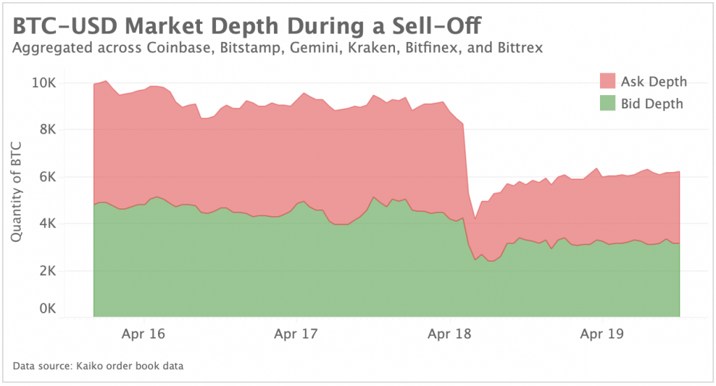 Am 18. April stürtzte der Preis von Bitcoin innerhalb weniger Stunden um mehr als $8k ab. Der Einbruch wurde durch milliardenschwere Zwangsliquidationen von überschuldeten Long-Positionen in den Futures-Märkten verschärft. Eine Zwangsliquidation tritt auf, wenn ein Trader die Margin-Anforderungen für das Halten einer Long- oder Short-Position nicht erfüllen kann, was zur automatischen Schliessung der Position führt. Wenn Long-Positionen liquidiert werden, werden Verkaufsaufträge ausgeführt, die einen Abwärtsdruck auf die Spotmärkte ausüben können. Wir können eine rasche Dezimierung der Markttiefe in den Spot-Orderbüchern für BTC-USD beobachten, die über 6 Börsen aggregiert werden. Am Montagmorgen hatte sich die Orderbuchtiefe noch nicht auf das Niveau vor dem Crash erholt, was wahrscheinlich darauf zurückzuführen ist, dass die Market Maker ihre Aktivitäten inmitten der Volatilität pausierten.