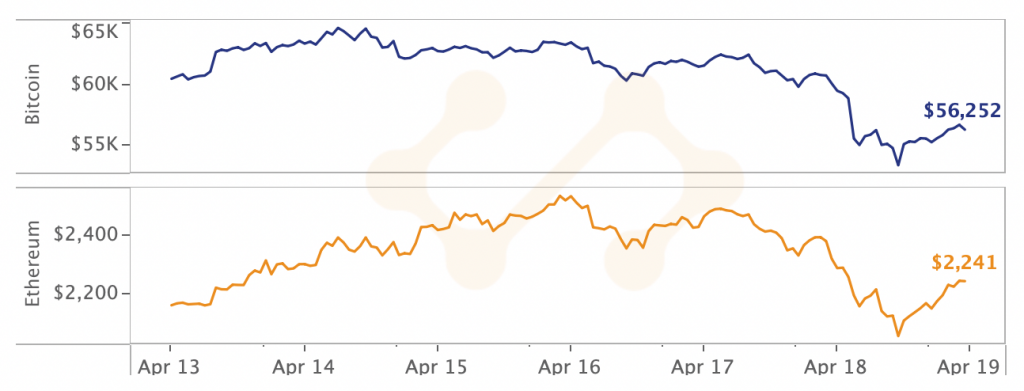 Letzte Woche schob die erfolgreiche direkte Notierung von Coinbase an der Nasdaq die Kryptomärkte auf neue Allzeithochs. Bitcoin übertraf zum ersten Mal $64'600. Allerdings ist der rasende Schwung seither ins Stocken geraten, was durch einen scharfen Wochenend-Selloff auf den Kryptomärkten und Milliarden an erzwungenen Liquidationen von Long-Positionen gekennzeichnet war. An einem Punkt stürzte Bitcoin auf bis zu $53'000 ab und beendete die Woche schliesslich mit einem Rückgang von mehr als 5%.