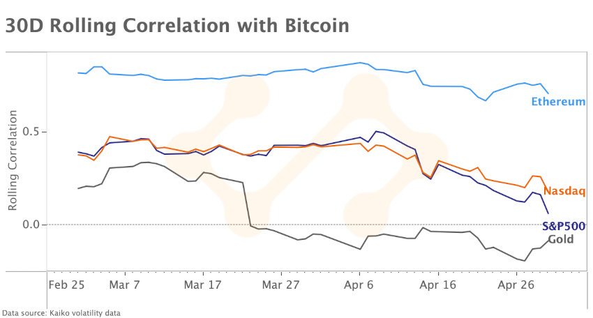 - Volatilität und Korrelationen: Die Korrelation von Bitcoin mit Aktien fiel auf den niedrigsten Stand seit Anfang Januar.
