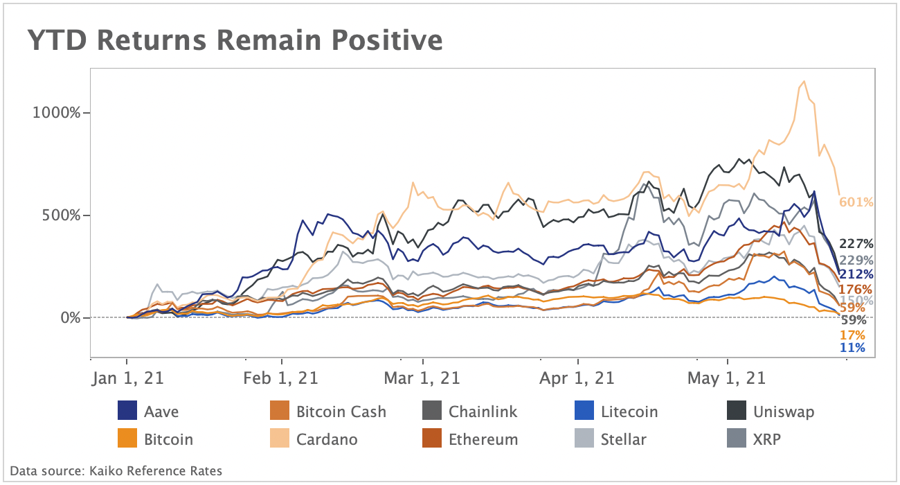 Die jüngste Verkaufswelle kann monatelange Gewinne ausgelöscht haben, aber die Kryptomärkte sind immer noch gut im grünen Bereich im Jahr 2021. Die meisten der Top-Altcoins sind konnten YTD dreistellige Anstiege verzeichnen: Cardano hat 600% zugelegt und viele DeFi-Token sind im +200% Bereich. In den letzten Monaten waren Bitcoin und Ethereum vergleichsweise ruhig, mit +17% und +176%. Währenddessen hat der S&P 500 Marktindex nur um 10% zugelegt.