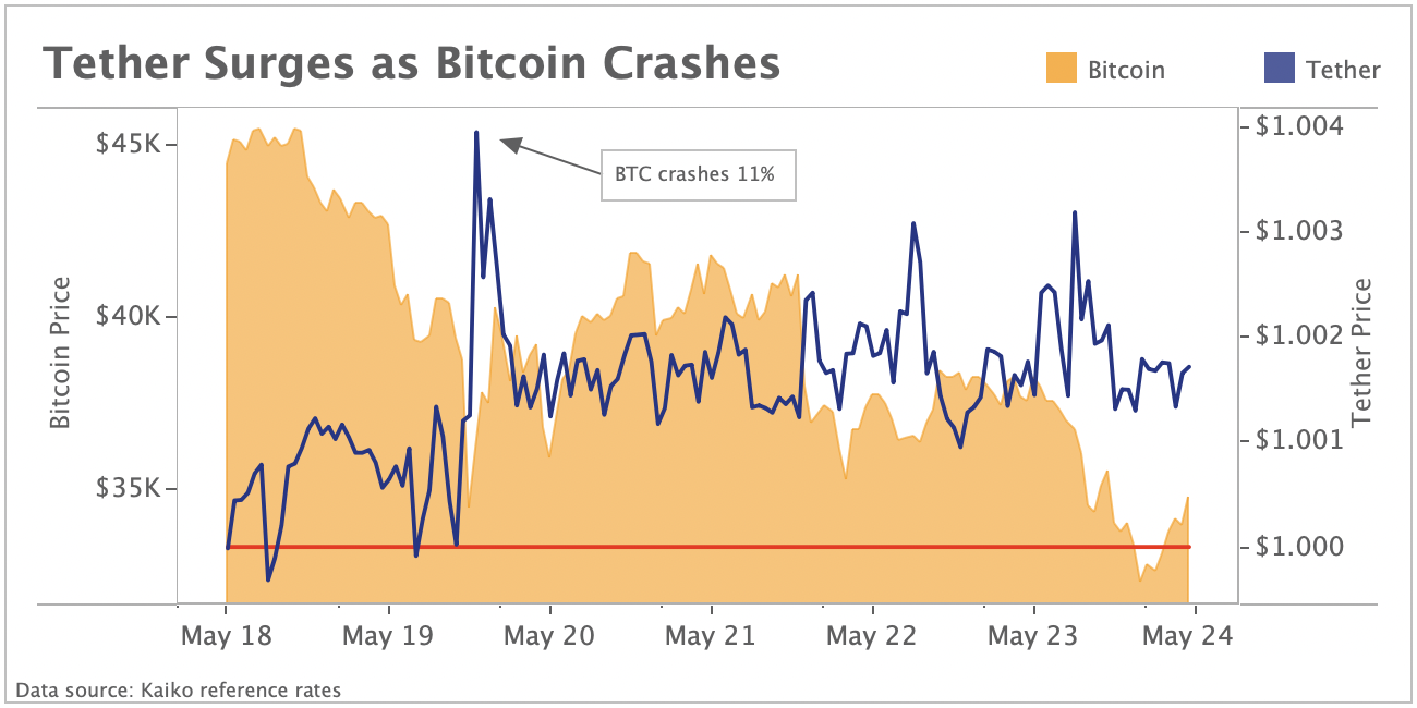 In früheren Newslettern haben wir die Tendenz von Tether identifiziert, während Bitcoin Verkaufswellen mit einer Prämie gehandelt zu werden. Die marktweite Korrektur in der letzten Woche hat dieses Phänomen noch weiter verdeutlicht. Wenn die Märkte abstürzen, verkaufen viele Händler ihre Kryptowährungen gegen Tether - den grössten Stablecoin, der genau 1:1 mit dem US-Dollar gehandelt werden soll. Allerdings erzeugt ein Anstieg der Nachfrage nach Tether ein Ungleichgewicht im Kaufdruck, was dazu führen kann, dass der Stablecoin an Wert verliert. In den letzten Monaten wurde Tether grösstenteils mit einem Aufschlag zum Dollar gehandelt, aber während eines Crashs können wir vorübergehende Ausschläge des Börsenkurses beobachten. Dies deutet darauf hin, dass Tether inmitten extremer Volatilität als sicherer Hafen betrachtet wird.