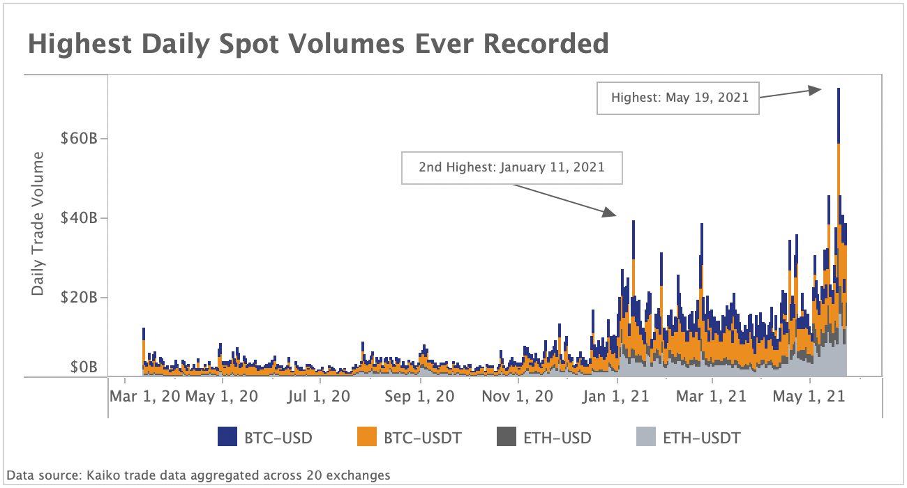 An den wichtigsten Bitcoin- und Ethereum-Spotmärkten wurden während der Verkaufswelle am 19. Mai Transaktionen im Wert von mehr als 70 Mrd. USD ausgeführt, was fast das Doppelte des nächsthöheren Tagesvolumens ist (aufgezeichnet am 11. Januar). Frühere Verkaufswellen wurden mit erzwungenen Liquidationen an den Derivatemärkten in Verbindung gebracht, aber die Liquidationen vom letzten Mittwoch übertrafen nicht den Rekord vom April. Die Vermutung liegt deshalb nahe, dass der Verkaufsdruck von den Spotmärkten ausging. Dies bedeutet jedoch nicht, dass die vielen Milliarden an Liquidationen nicht zu dem rasanten Preiseinbruch von Bitcoin beigetragen haben.