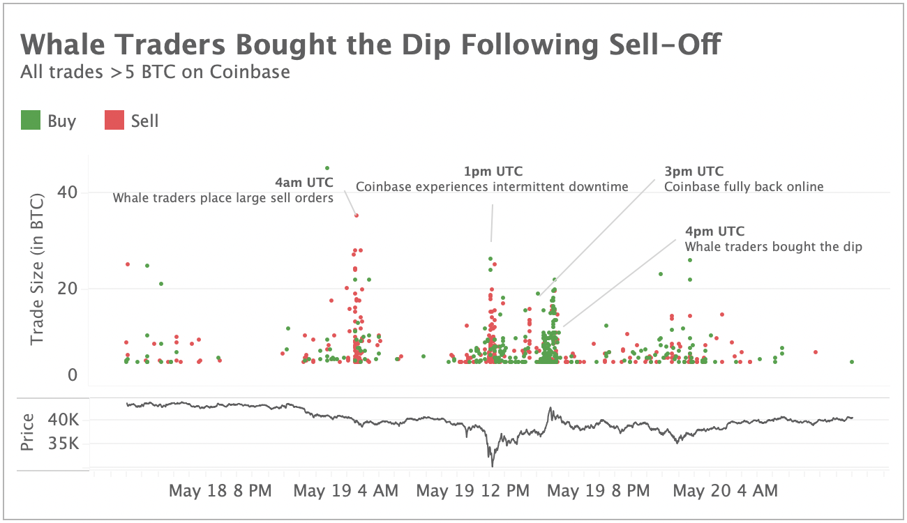 Wir können beobachten, dass gegen 4 Uhr UTC grosse Händler begannen, Markt-Verkaufsaufträge zu platzieren. Dies geschah, als Bitcoin unter $40k fiel - viele davon mit einem Wert von mehr als $500k. Es passierte nicht viel bis etwa 13 Uhr UTC, als der Preis zu fallen begann und die Menge der grossen Verkaufsaufträge in die Höhe schnellte. Um diese Zeit begann Coinbase intermittierende Ausfallzeiten zu erleben. In der Folge der Verkaufswelle können wir beobachten, dass grosse Händler begannen, den "Dip" in grosser Zahl zu kaufen. Dies führte dazu, dass der Bitcoin-Preis auf über $40k anstieg, nur um dann wieder abzustürzen, als der Kaufdruck nachliess.
