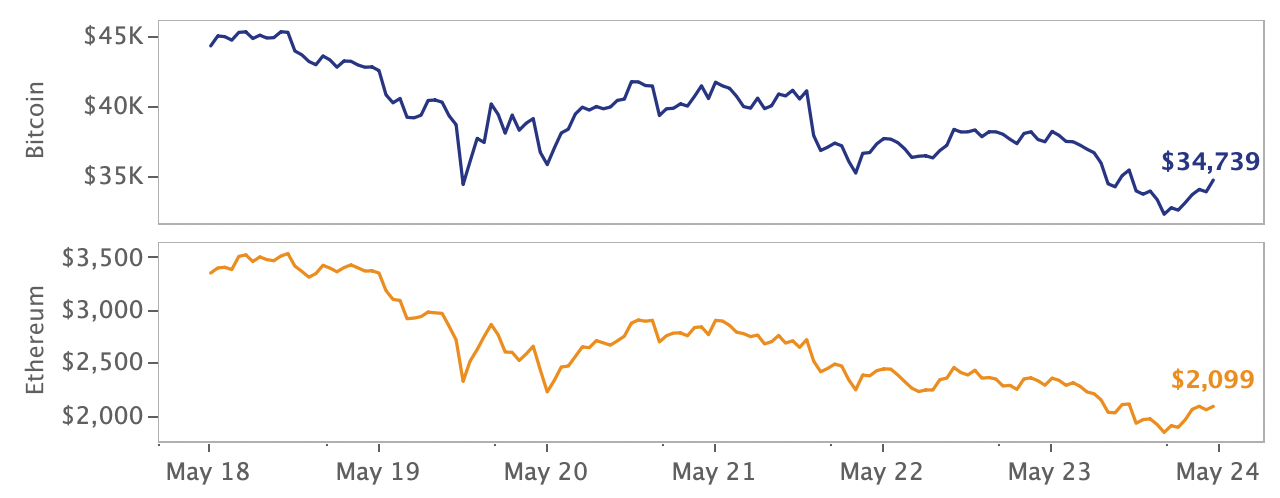 Es war eine harte Woche für die Kryptomärkte. Fast alle Top-Assets sind zweistellig eingebrochen. Es gibt nie einen einfachen Grund, der die Ursache für eine marktweite Korrektur erklärt. Doch die Tweets von Elon Musk waren wahrscheinlich das Streichholz, das genau im richtigen Moment die Lunte entzündete. In den vergangenen Monaten haben wir mehrere Trends festgestellt, die dazu führten, dass die Märkte schliesslich einen Wendepunkt erreichten: übermässiges Hebeln an den Derivatemärkten, ein starker Rückgang der Orderbuchliquidität an den Spotmärkten, Probleme mit der Börseninfrastruktur und die "Memeifizierung" des Handels. Zusammengenommen waren diese marktweiten Ineffizienzen dazu bestimmt, eine Korrektur zu erzwingen. Es sieht so aus, als hätten grosse Marktteilnehmer den "Dip" am vergangenen Mittwoch gekauft - doch der Kaufdruck reichte nicht aus, um weitere Verluste über das Wochenende zu verhindern.