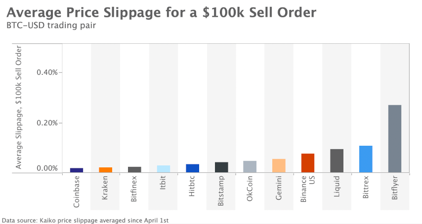 Coinbase, Kraken und Bitfinex schnitten, mit einer durchschnittlichen Slippage von etwa 0.02% im April und Mai, von allen BTC-USD-Märkten am besten ab. Der BTC-USD-Markt von Bitflyer schnitt am schlechtesten ab, mit mehr als 0.2% Slippage für jede 100'000 USD-Order.