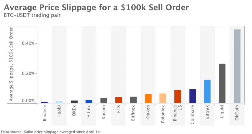 Wie erwartet hatten Binance, Huobi, und Okex die niedrigste Slippage für ihre BTC-USDT-Märkte, im Durchschnitt 0.01% in den letzten zwei Monaten. Sowohl Binance als auch Huobi haben eine bessere Liquidität als der liquideste BTC-USD-Markt. Dies ist ein weiterer Beweis dafür, dass Tether-Märkte wichtige Liquiditäts-Quellen in Krypto sind.