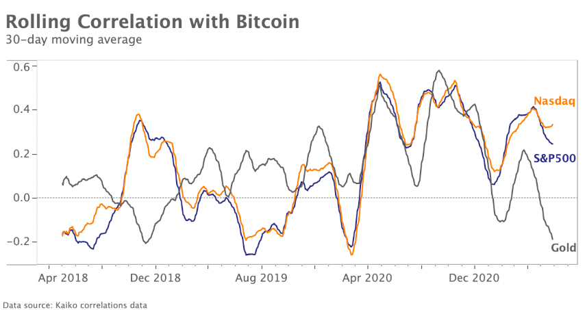 Bitcoin wurde wegen seiner ähnlichen Wertaufbewahrungseigenschaften immer mit digitalem Gold verglichen. Als die globalen Finanzmärkte im März 2020 zusammenbrachen, stiegen Bitcoin und Gold auf ihre bisher stärkste Korrelation. Für einen Grossteil des Jahres 2020 hielt diese Korrelation stark an. Da sich die Märkte jedoch neu ausrichten und die Pandemie in den Vereinigten Staaten sich dem Ende nähert, ist diese Korrelation wieder auf den niedrigsten Stand seit 2018 gesunken.