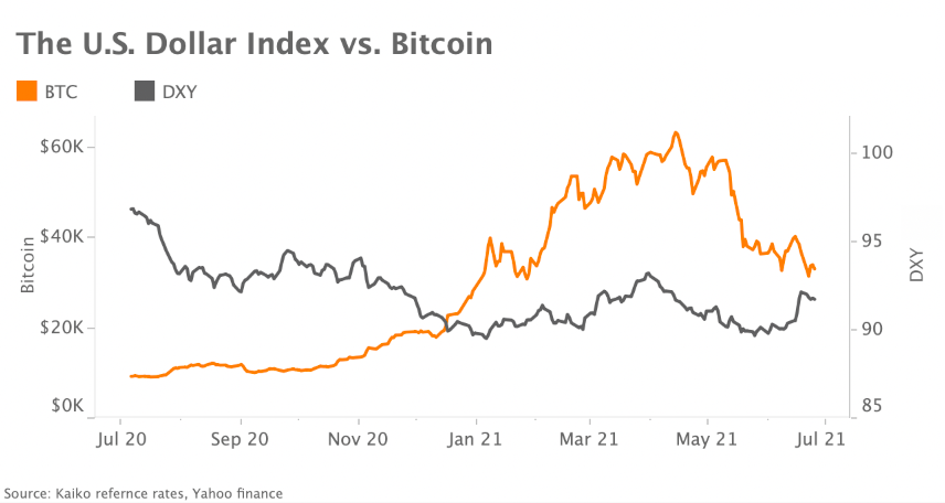 Der US-Dollar ist seit Mitte Juni gestiegen, nachdem die Fed aufgrund wachsender Inflationssorgen beschlossen hatte, den Zeitplan für die Zinserhöhung zu beschleunigen. Der Dollar-Index (DXY), der die Performance des Greenbacks im Vergleich zu einem Basket konkurrierender Währungen misst, legte im Juni um 2.9% zu, während Bitcoin den dritten Monat in Folge negative monatliche Renditen verzeichnete. Im vergangenen Jahr hat die Geldpolitik der Fed risikofreudige Assets wie Bitcoin begünstigt, aber einen negativen Einfluss auf den U.S. Dollar gehabt. Dies führte vorübergehend zu einer inversen Korrelation zwischen den beiden. Der DXY fiel konsequenterweise auf Mehrjahrestiefs, während Bitcoin auf Allzeithochs anstieg.