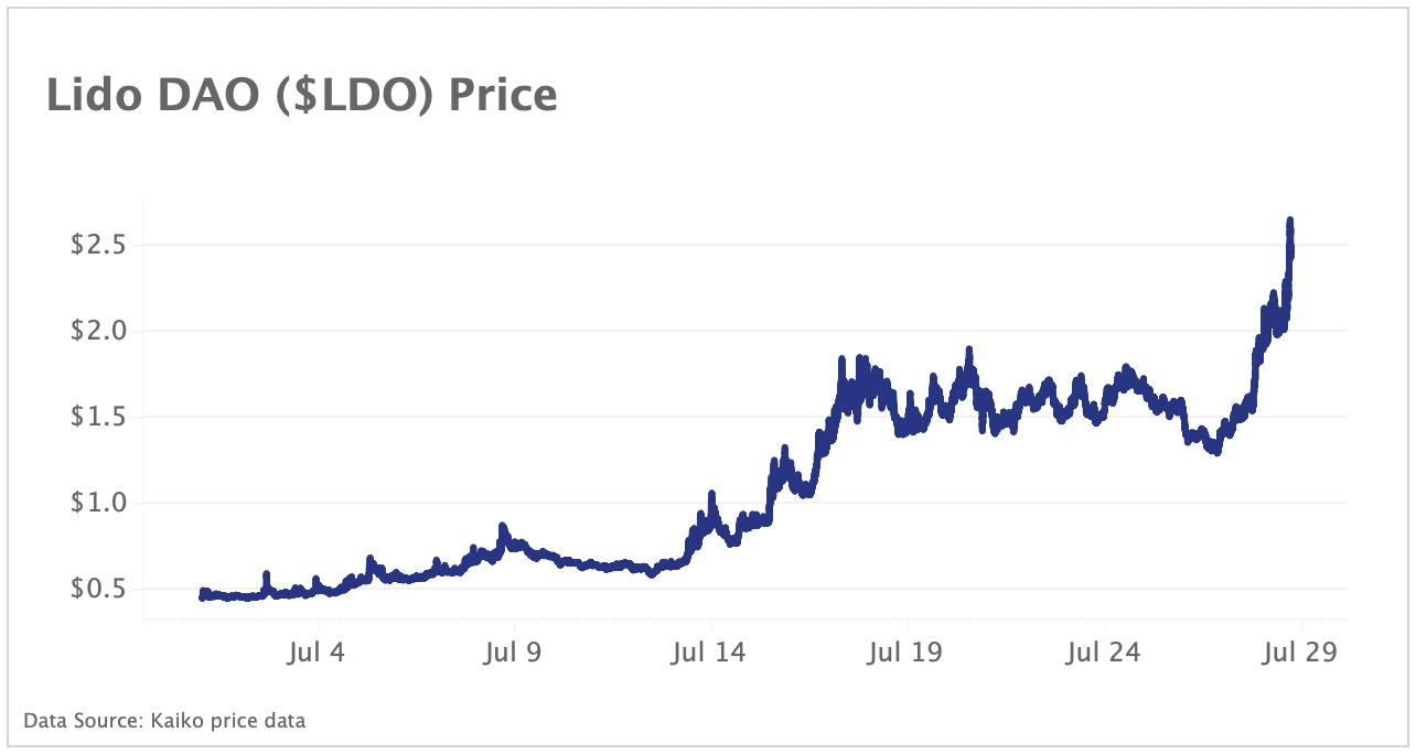 Dragonfly reagierte daraufhin mit einem neuen Angebot, das eine Sperrfrist von einem Jahr vorsah und von der Lido-Community gut aufgenommen wurde. Das Angebot enthielt jedoch eine Klausel, die Dragonfly zum Rückzug des Angebots berechtigte, falls der Preis von LDO über 2.25 USD steigen sollte, was letzte Woche kurzzeitig geschah. Es wurde nicht bekannt gegeben, ob der Vorschlag umgesetzt wird, während sowohl Dragonfly als auch Lido in den kommenden Tagen den Preis des Tokens besonders aufmerksam beobachten werden. Der Preis von LDO ist von einem Tiefststand von 1.30 USD auf einen Höchststand von knapp über 2.60 USD gestiegen, als sich die Märkte im Allgemeinen erholen.