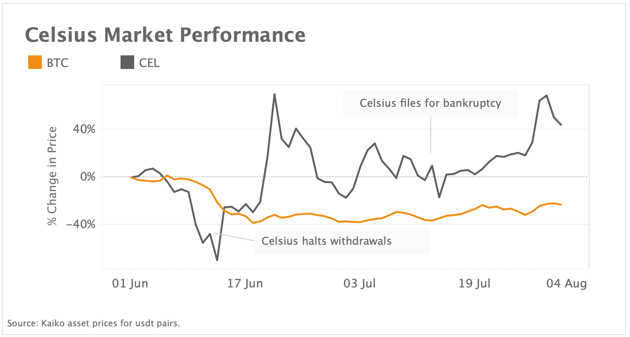 Der CEL-Token der Krypto-Kreditplattform Celsius Network hat sich seit Anfang Juni besser entwickelt als Bitcoin, obwohl das Unternehmen Mitte Juli nach wochenlangen Turbulenzen Insolvenz angemeldet hat. CEL wies in den letzten zwei Monaten eine starke Volatilität auf und fiel auf ein Rekordtief von 0.22 USD, nachdem die Plattform am 12. Juni Abhebungen gestoppt hatte, bevor er in weniger als zehn Tagen fast um das Sechsfache auf 1.29 USD anstieg. Zwar hat sich der CEL-Kurs seit Anfang Juli bei etwa 0.8 USD stabilisiert, doch liegt er nach wie vor deutlich unter seinem Allzeithoch von fast 8 USD vor einem Jahr.