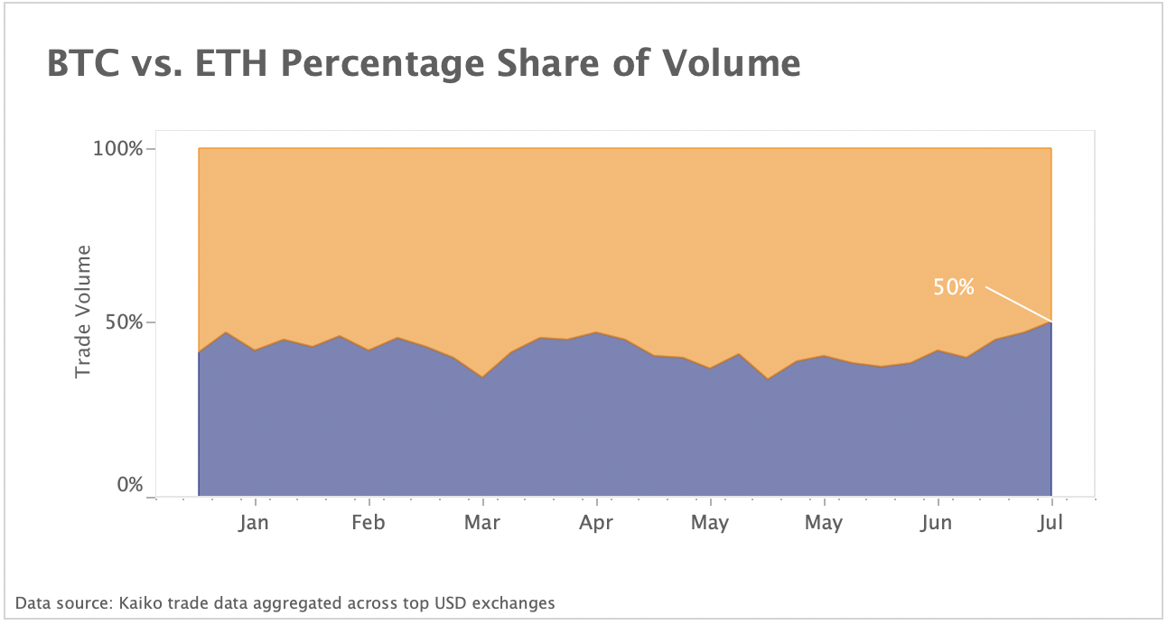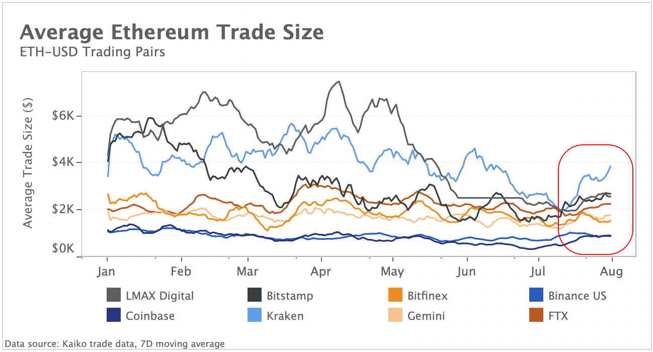 Zum ersten Mal in diesem Jahr erreichte der Marktanteil von Ether am Handelsvolumen eine Parität von 50% mit dem von Bitcoin, während die Umstellung des Netzwerks auf Proof-of-Stake - bekannt als Merge - immer näher rückt. Die Kryptowährung entwickelte sich im Juli besser als Bitcoin und verzeichnete sowohl an den Spot- als auch an den Derivatemärkten starke Zuflüsse. Im vergangenen Monat sind die durchschnittlichen Handelsgrössen für die liquidesten ETH-USD-Paare an den meisten Börsen in die Höhe geschnellt, was darauf hindeutet, dass grössere Händler wieder investieren, wenn sich die Preise erholen und die Marktstimmung wieder anzieht.