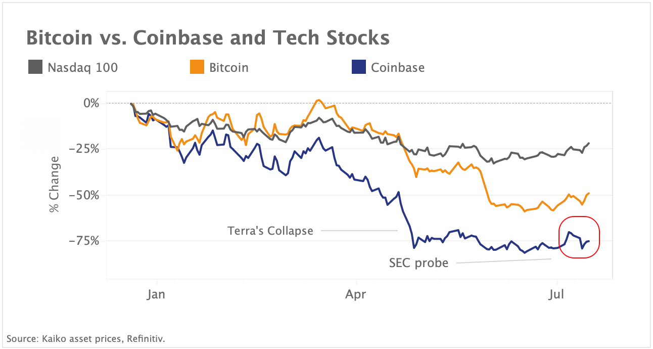 Letzte Woche verlor der Aktienkurs von Coinbase an einem einzigen Tag fast ein Fünftel seines Wertes, nachdem bekannt wurde, dass die US-Börsenaufsichtsbehörde (SEC) gegen die Börse wegen des Angebots nicht registrierter Wertpapiere ermittelt. Die Untersuchung führte zu umfangreichen Verkäufen durch den auf Technologie spezialisierten Vermögensverwalter ARK Invest, der über 1.4 Mio. Coinbase-Aktien verkaufte. Während Coinbase im vergangenen Jahr meist hinter BTC und dem breiteren Markt zurückgeblieben ist, hat sich der Abstand im Jahr 2022 vergrössert. Insgesamt fiel der Aktienkurs in der letzten Woche um 11% und 76% YTD. Coinbase, das den Grossteil seiner Einnahmen aus Transaktionsgebühren bezieht, meldete im ersten Quartal des Jahres einen grösseren Verlust als erwartet und kündigte Entlassungen unter Berufung auf den Bärenmarkt an. Sein Spotmarktanteil schrumpfte beträchtlich von einem Mehrjahreshoch von über 60% im Dezember 2021 auf rund 40% im Juli.