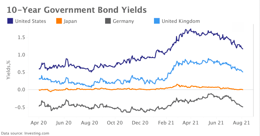 In der vergangenen Woche fielen die Renditen 10-jähriger US-Staatsanleihen auf den niedrigsten Stand seit Februar, nachdem die Sorgen um die Delta-Variante und die Impfquoten gewachsen waren. Ein ähnlicher Trend zeichnete sich weltweit ab: Die Renditen 10-jähriger deutscher Bundesanleihen sanken in dieser Woche um mehr als 3 Basispunkte auf -0.485, die britischen Renditen fielen um 2 Basispunkte, und die japanischen Renditen sanken auf ein Jahrestief von 0.004. Sinkende Renditen deuten im Allgemeinen darauf hin, dass die Märkte eine starke Verlangsamung des Wachstums oder eine Rezession vorhersagen. Renditen und Anleihekurse sind umgekehrt korreliert und die Anleger haben sich in letzter Zeit trotz der relativ starken wirtschaftlichen Erholung auf Anleihen gestürzt. Dies deutet darauf hin, dass Anleihekurse und Renditen von den makroökonomischen Fundamentaldaten abgekoppelt sind.