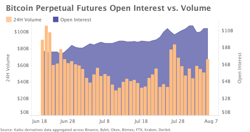 Seit dem Short Squeeze Ende Juli ist das aggregierte Open Interest an 7 Börsen stetig gestiegen, während die Handelsvolumina gesunken sind. Zusammen mit den nachlassenden Spotpreisen deutet dies darauf hin, dass die Erholung noch nicht gefestigt ist. Nachdem das aggregierte 24-Stunden-Handelsvolumen unmittelbar nach dem Short Squeeze auf 85 Mrd. USD angestiegen war, ist es seither rückläufig und liegt weiterhin deutlich unter dem Niveau von Ende Juni. Insgesamt scheint die Handelsaktivität bei Bitcoin-Perpetuals deutlich geringer zu sein als im Juni.