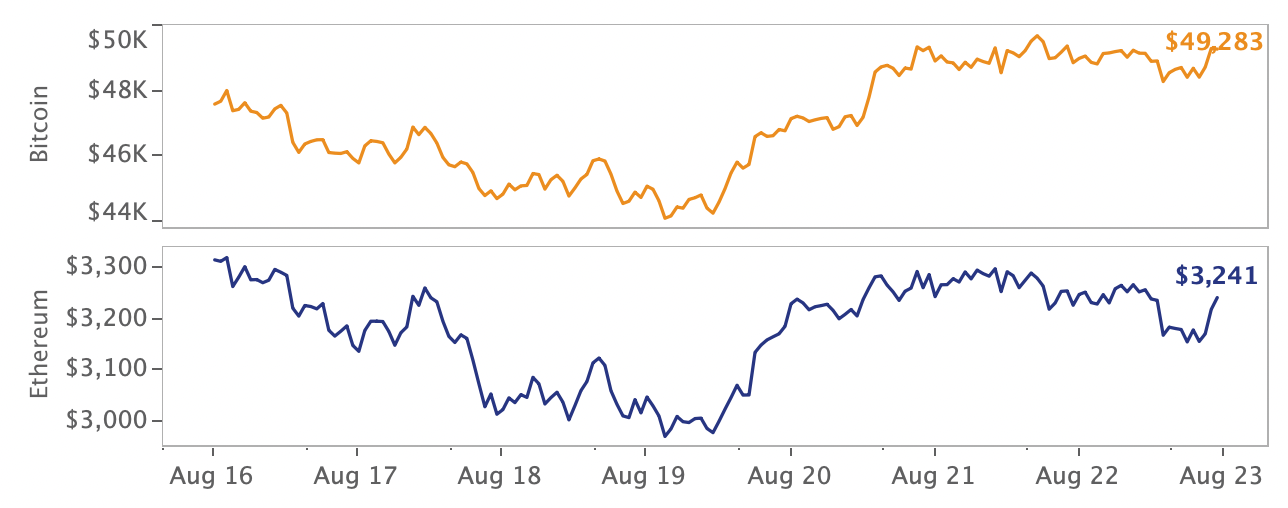 Bitcoin durchbricht $50k. Zum ersten Mal seit Anfang Mai hat Bitcoin die gepriesene 50.000-Dollar-Marke überschritten - ein Zeichen dafür, dass die Märkte wieder richtig in Schwung gekommen sind. In den letzten 30 Tagen sind Bitcoin und Ethereum um bemerkenswerte 44% bzw. 50% gestiegen, nachdem sie zuvor monatelang nur geringe Kursgewinne und ein geringes Volumen verzeichnet hatten. Das Interesse der institutionellen Anleger nahm letzte Woche zu, als sowohl Wells Fargo als auch JPMorgan Bitcoin-Fonds bei der SEC registrierten. Coinbase kündigte an, als erstes börsennotiertes Unternehmen 10% der künftigen Gewinne für Kryptowährungen bereitzustellen.