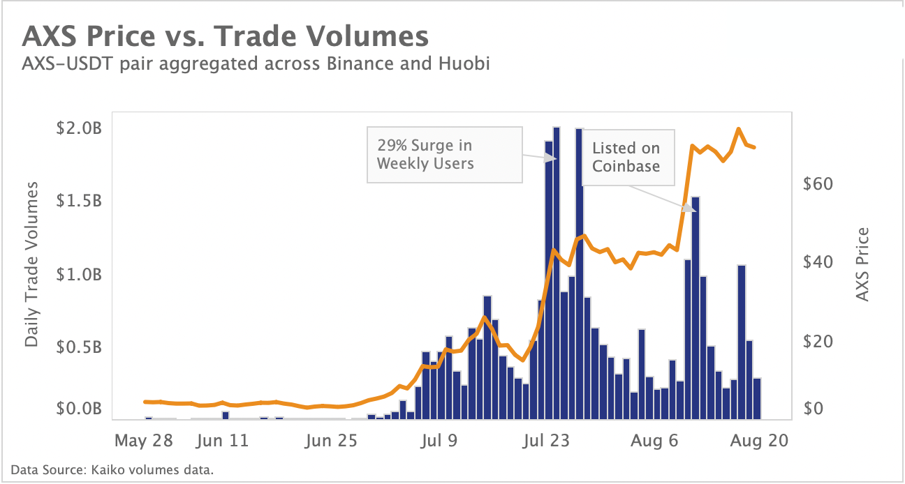 Oben sehen Sie das tägliche Volumen und den Preis von AXS auf Binance und Huobi, den beiden grössten Märkten für diesen Token. Vor Juni lag das tägliche Volumen bei nahezu Null und hat seither einen Höchststand von 2 Mrd. USD/Tag erreicht. Wir beobachten erhebliche Schwankungen bei den täglichen Volumina, die wahrscheinlich auf die wilde Volatilität des Tokens zurückzuführen sind, der im Laufe von fünf Wochen von 5 auf 69 US-Dollar gestiegen ist.