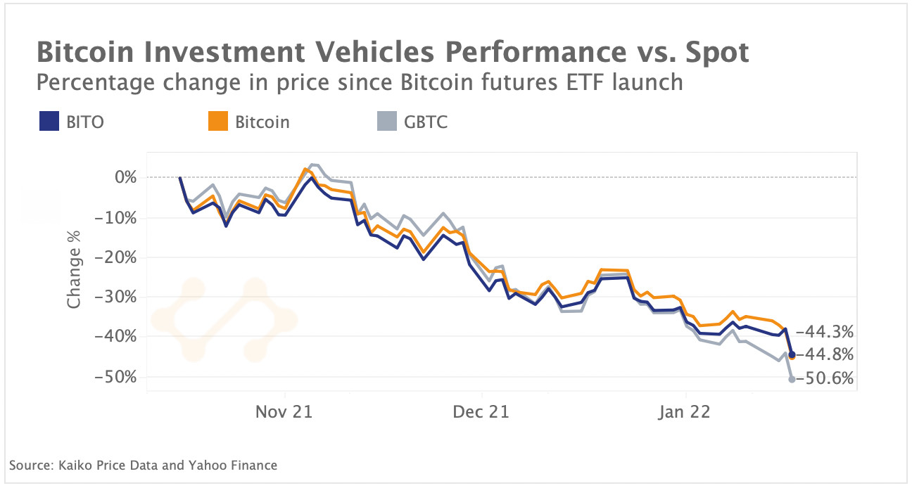 Da der Bitcoin-Kurs seit seinem Allzeithoch im November um mehr als 40% gefallen ist, haben auch regulierte Anlageangebote, die ein Exposure in Kryptowährungen ermöglichen sollen, ohne diese direkt zu besitzen, einen Rückschlag erlitten. Oben sehen Sie die Performance von zwei Anlageoptionen im Vergleich zum Kassakurs - dem Proshares Bitcoin ETF (BITO), der die BTC-Futures-Preise abbildet, und dem Grayscale Bitcoin Trust (GBTC) - dem weltweit grössten Krypto-Trust. Während beide Produkte einen bequemen Zugang zum stark fragmentierten Kryptomarkt bieten, haben sie unterschiedliche Kompromisse, die durch ihre Tracking-Performance und ihr Gebührenmodell veranschaulicht werden. Wir stellen fest, dass GBTC seit dem 20. Oktober um 6% hinter den Kassakursen zurückgeblieben ist, während BITO eine etwas bessere Performance erzielte.
