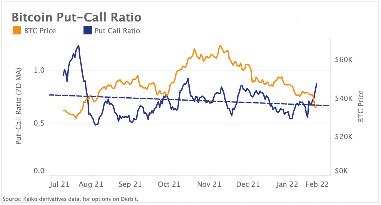 Das Put-Call-Verhältnis von Bitcoin erreichte letzte Woche den höchsten Stand seit Oktober, was auf eine wachsende negative Stimmung unter den Anlegern hindeutet. Normalerweise kaufen Händler Call-Optionen, um auf Preissteigerungen zu setzen, und suchen Schutz durch Puts, wenn sie Preisrückgänge vorhersehen. Ein steigendes Put-Call-Verhältnis deutet darauf hin, dass die Nachfrage nach Puts (bärische Wetten) im Verhältnis zur Nachfrage nach Calls (bullische Wetten) steigt. Oben sehen Sie ein Diagramm des Bitcoin-Optionen-Put-Call-Verhältnisses auf Deribit, dem grössten Markt für Kryptowährungsoptionen, zusammen mit dem BTC-Kassakurs. Wir beobachten, dass das Put-Call-Verhältnis im Januar einen stetigen Aufwärtstrend aufweist, nachdem es im Dezember gesunken war.