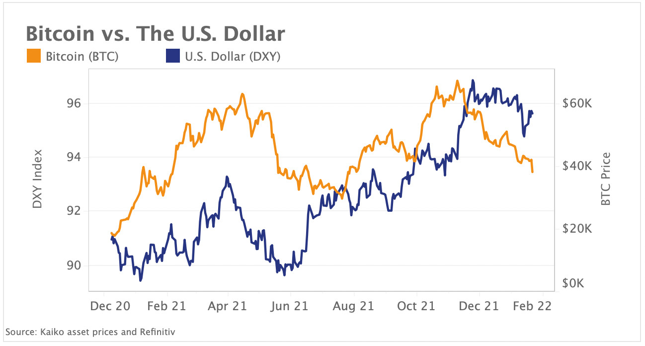 Normalerweise sollten die Verschärfung der finanziellen Bedingungen und die robusten Wachstumserwartungen in den USA den Greenback stützen. Während früherer Zinserhöhungszyklen tendiert der US-Dollar jedoch dazu, in den Monaten vor einer Zinserhöhung zu steigen und in den Monaten danach zu fallen. Dies könnte sich positiv auf Bitcoin und US-Aktien auswirken, die sich seit dem Beginn der Pandemie-Ära der Geldpolitik in die entgegengesetzte Richtung wie der Dollar entwickelt haben.