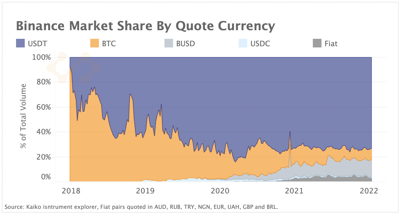 Dieser Trend lässt sich auch beobachten, wenn man den Marktanteil des Handelsvolumens auf Binance, der grössten Kryptowährungsbörse, betrachtet. Die Dominanz der BTC-denominierten Instrumente hat seit 2018 drastisch abgenommen und ist von 90% des Volumens auf nur noch 10% gesunken.