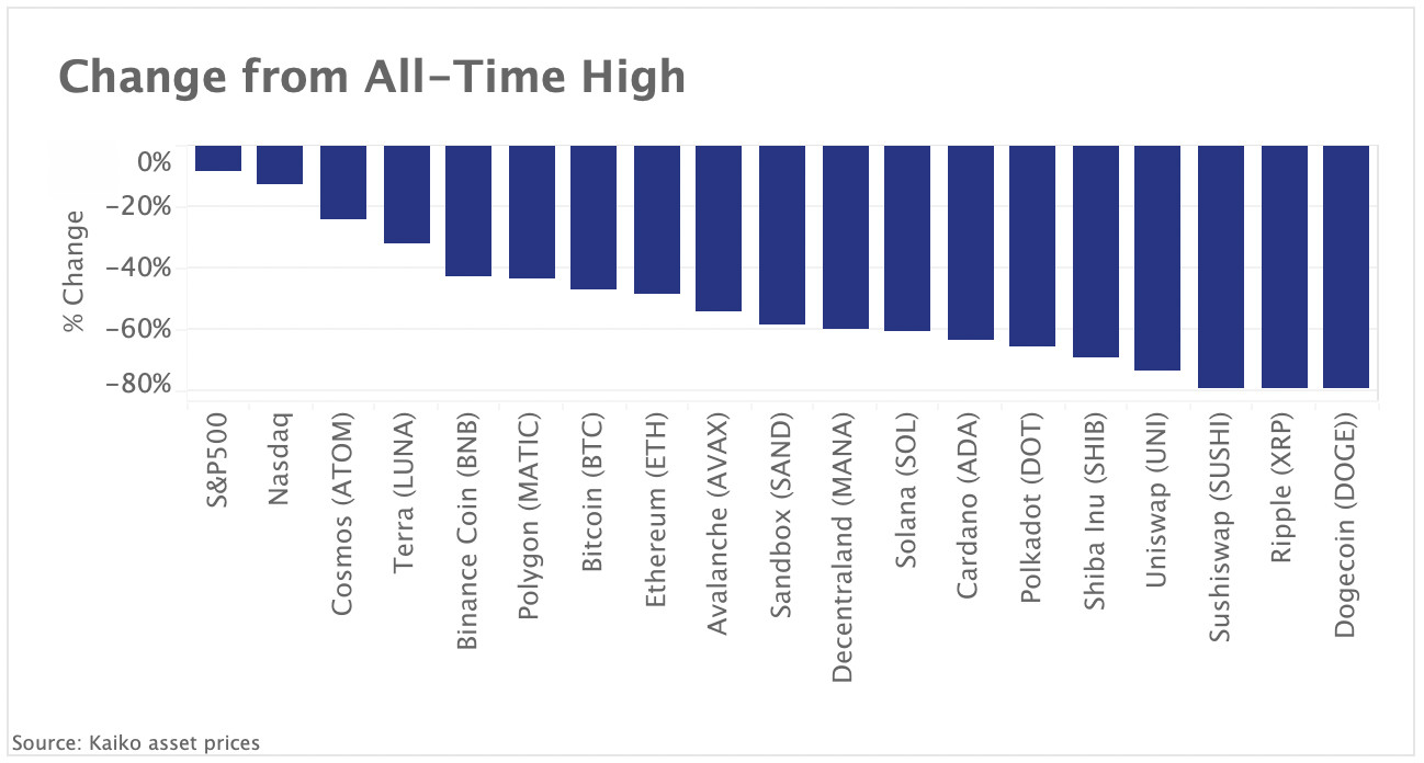 Krypto-Vermögenswerte befinden sich ebenso wie die traditionellen Finanzmärkte im Korrekturbereich. Die 100 wichtigsten Krypto-Vermögenswerte nach Marktkapitalisierung beendeten die Woche alle im Minus. Oben sehen Sie die prozentuale Veränderung im Vergleich zu den bisherigen Allzeithochs der wichtigsten Kryptowährungen, verglichen mit dem S&P 500 und dem Nasdaq. Der Nasdaq ist seit den im November erreichten Höchstständen um ~15% gefallen, während Bitcoin und Ethereum mehr als 40% von ihren Höchstständen entfernt sind. ATOM von Cosmos, LUNA von Terra und Binance Coin (BNB), die im Dezember alle gut abschnitten, verzeichneten die geringsten Rückgänge im Vergleich zu anderen Kryptoanlagen. Dogecoin (DOGE), Ripple (XRP) und die Governance-Tokens der DEXs Uniswap und Sushiswap waren mit Korrekturen von fast 80% die schlechtesten Performer.