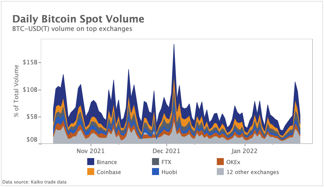 Die Bitcoin-Spothandelsvolumina haben sich seit November parallel zu einer rückläufigen Entwicklung der BTC-Preise verhalten. Die Volatilität der letzten Woche liess das Volumen jedoch auf das höchste Level seit der Verkaufswelle vom 4. Dezember ansteigen. Insgesamt lagen die durchschnittlichen Tagesvolumina an den wichtigsten Kryptowährungsbörsen im letzten Monat unter 5 Mrd. US-Dollar und sind damit seit dem frühen Herbst deutlich gesunken. Der Grossteil des Spotvolumens findet immer noch auf Binance statt, aber in letzter Zeit haben Coinbase und FTX mehr Marktanteile erobert. Okex und Huobi haben am meisten unter dem regulatorischen Durchgreifen in China gelitten.