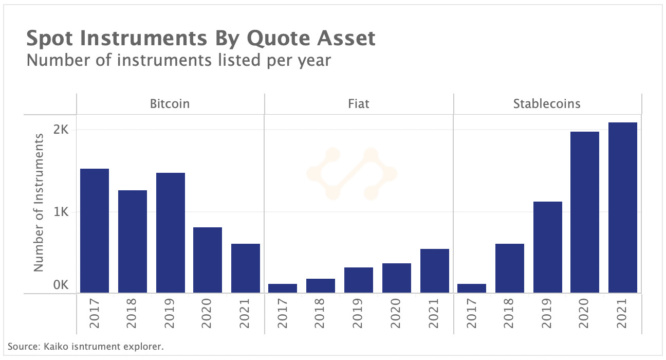 - Volumendynamik: Die Anzahl der neuen BTC-denominierten Handelspaare ist seit 2019 zusammen mit dem Anstieg der Stablecoins stark zurückgegangen.