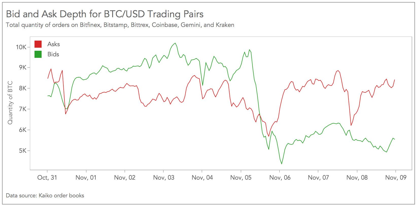 Die Markttiefe nahm vom 5. bis 7. November auf der Geldkursseite der Auftragsbücher an 6 Börsen stark ab. Die Briefkurstiefe blieb größtenteils nicht weit von ihrem Durchschnitt entfernt. Die Gebotstiefe nahm ab, als Bitcoin das Preisniveau von 14.000 $ durchbrach, und fiel weniger als einen Tag später erneut, als das Preisniveau von 15.000 $ durchbrochen wurde. Market Maker gruppieren Aufträge häufig um wichtige Preisniveaus herum. Sobald diese Niveaus durchbrochen werden, werden die Auftragsbücher neu ausgerichtet.