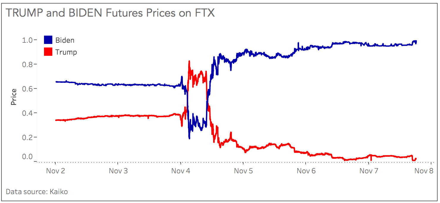 In der Wahlnacht (und den darauf folgenden Tagen) erlebten die Wahlwettmärkte einen sprunghaften Anstieg des Handelsvolumens an der Börse FTX, da Händler ihre Chancen nutzten, auf die Wahlergebnisse zu spekulieren. Der Preis jedes Futures-Kontrakts spiegelt die vorausgesagte prozentuale Gewinnchance jedes Kandidaten wider, die mit fortschreitender Wahlnacht immer volatiler wurde. Zu einem bestimmten Zeitpunkt räumten die Händler Trump eine Gewinnchance von mehr als 80% ein, bevor diese mit der Nachricht von Briefwahlergebnissen in die Tiefe stürzten. Letztendlich besaßen die TRUMP Futures mehr als doppelt so viel Handelsvolumen wie die BIDEN Futures. Ein Zeichen dass Prognosemärkte ein Wachstumsbereich für die Kryptowährungsbranche sein können.