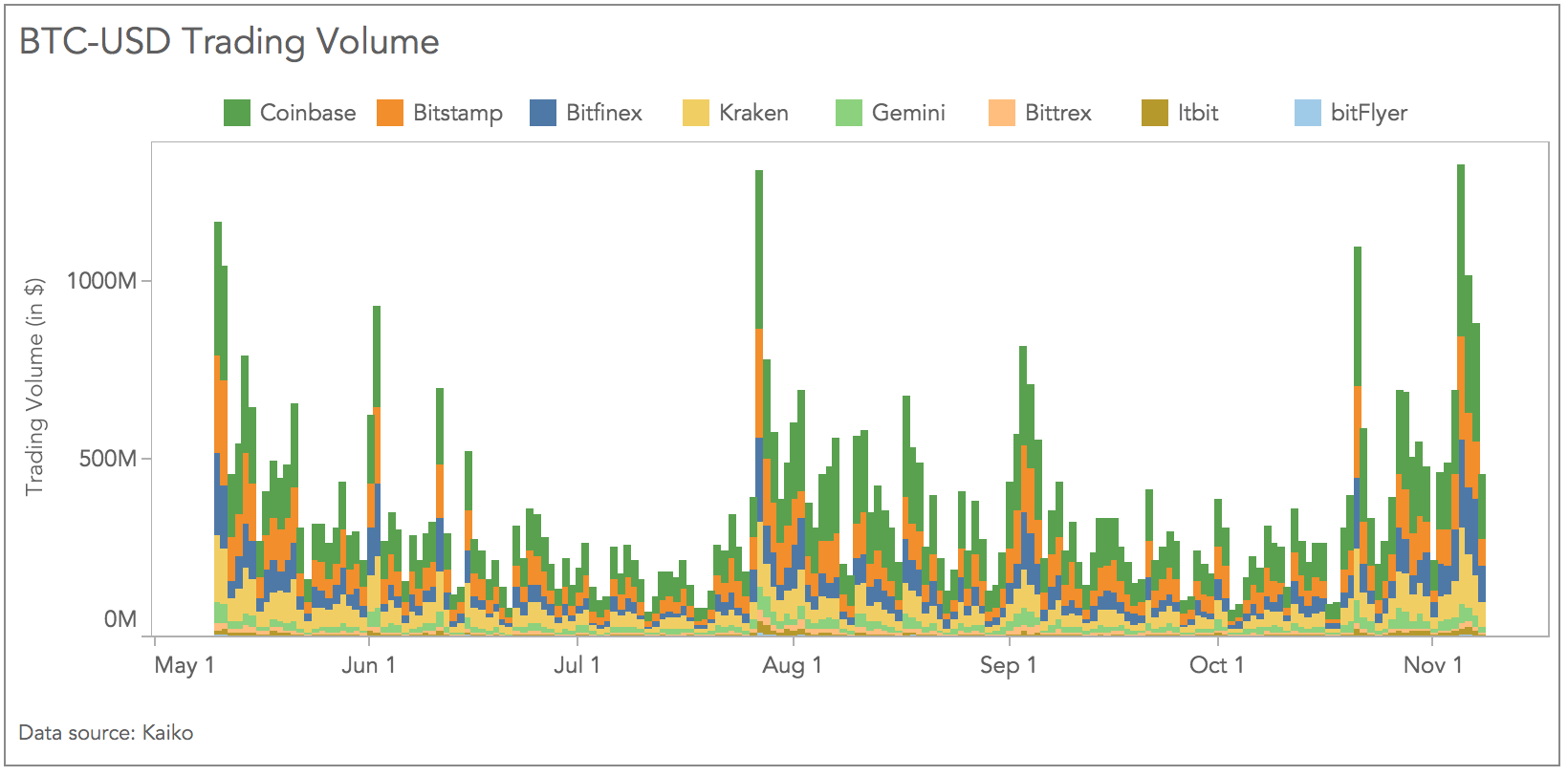 Die Aufregung über den aktuellen Bull Run von Bitcoin ist im Vergleich zum wilden Lauf im Jahr 2017 objektiv gedämpfter. Dennoch sind die Handelsvolumina von Bitcoin seit Mitte Oktober in die Höhe geschnellt, nachdem als Reaktion auf positive institutionelle Nachrichten und makroökonomische Unsicherheiten der Schwung für den Vermögenswert weiter zunimmt. Der Höhepunkt des Volumens wurde am 5. November erreicht, als Bitcoin den Widerstand bei $14.000 und $15.000 durchbrach und an 8 Börsen $1,2 Milliarden erreichte.