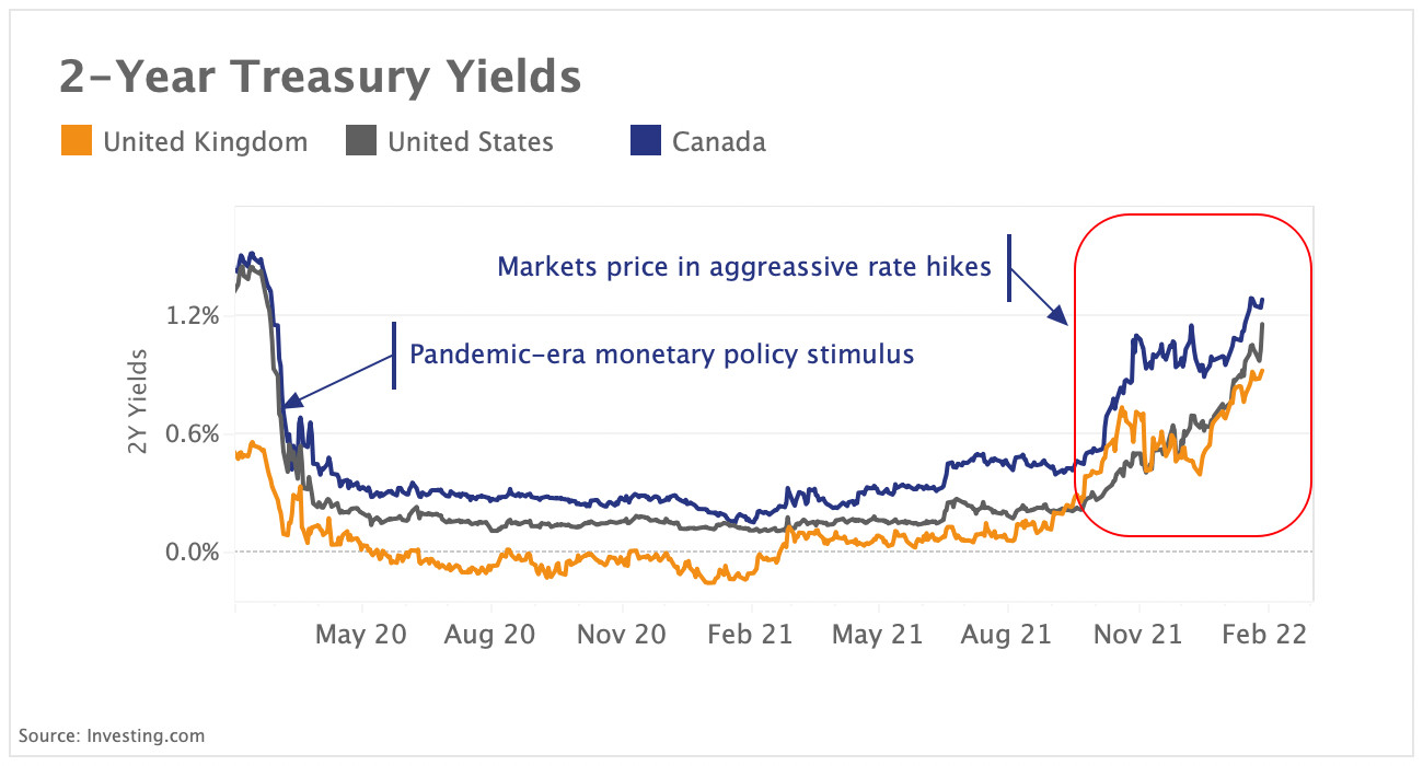 In der vergangenen Woche kündigte die US-Notenbank trotz volatiler Aktien und sinkender Risikostimmung ihre erste Zinserhöhung für März an. Dies führte dazu, dass die Renditen kurzfristiger US-Staatsanleihen - ein Indikator für die Markterwartungen in Bezug auf die künftige Ausrichtung der Geldpolitik - den grössten Tagesanstieg seit fast zwei Jahren verzeichneten. Das obige Bild zeigt, dass auch die Renditen 2-jähriger kanadischer und britischer Staatsanleihen seit September in die Höhe geschnellt sind, da die Märkte eine Aufhebung des so genannten "Fed Put" einpreisen, welcher sich auf die Unterstützung der Zentralbank für die Aktienmärkte in schwierigen Zeiten bezieht. Die Verschärfung der finanziellen Bedingungen war in den letzten Monaten ein wichtiger Gegenwind für die Bewertungen von Risikoanlagen und dürfte die Aktienkurse nach unten drücken, was dazu führen könnte, dass die Anleger sichere Häfen suchen.