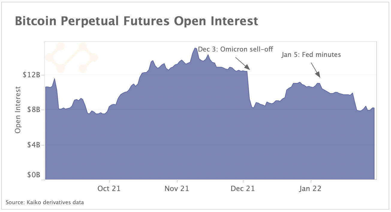 Nach der jüngsten Volatilitätswelle ist das Open Interest an Bitcoin-Perpetual-Futures im letzten Monat von 10 Mrd. auf 8 Mrd. US-Dollar gefallen. Das Open Interest ist nun auf dem niedrigsten Stand seit September, was auf eine geringe Hebelwirkung an den Derivatemärkten schliessen lässt.