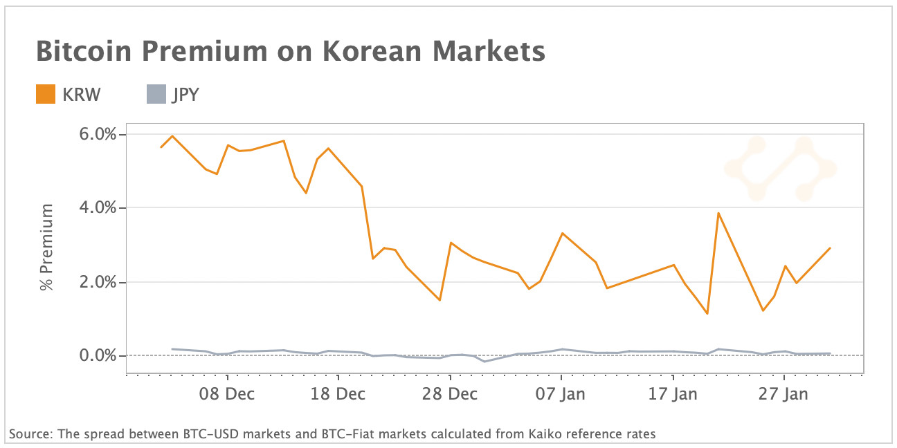 Die Bitcoin-Präme auf koreanischen Märkten - bekannt als "Kimchi-Prämie" - hat in den letzten Wochen einen stetigen Abwärtstrend gezeigt und ist von rund 6% Anfang Dezember auf 1.4% Ende Januar gefallen. Die Kimchi-Prämie ist ein Kryptomarktphänomen, das seit 2017 existiert und sich auf eine positive Spanne im Bitcoin-Preis zwischen dem USD- und dem koreanischen Markt bezieht. Die Nachfrage nach Bitcoin hat sich abgeschwächt, da grosse koreanische Börsen dazu gezwungen wurden, Abhebungen von nicht verifizierten Krypto-Wallets wie MetaMask und Ledger zu blockieren. Denn Südkorea hat im vergangenen Jahr seine regulatorische Haltung gegenüber digitalen Vermögenswerten verschärft. Dies hat zu einer Konsolidierung des Marktes geführt, da mehrere führende ausländische Börsen wie Binance und Huobi ihren Betrieb in dem Land eingestellt haben, nachdem sie sich nicht bei der Anti-Geldwäsche-Behörde des Landes registriert hatten.