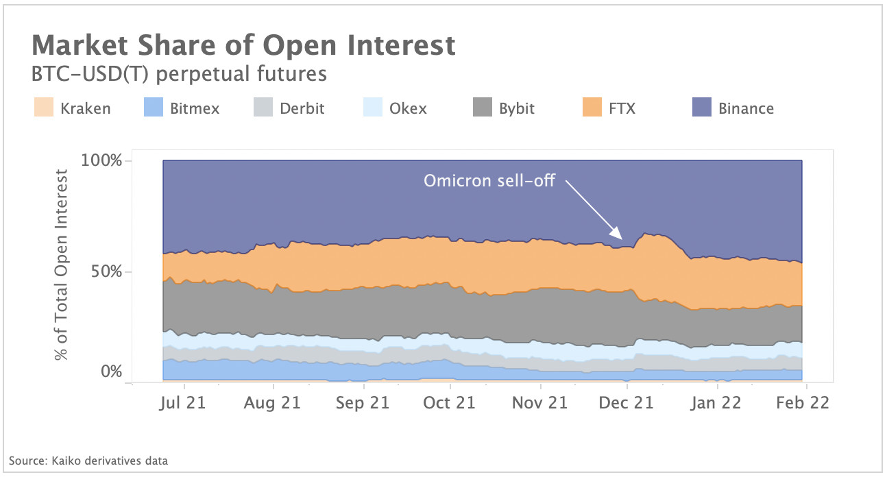 Trotz der jüngsten Volatilitätsschübe erholte sich der Marktanteil von Binance am Open Interest für Perpetual Futures im Januar, nachdem er während des Ausverkaufs im Dezember ein Mehrmonatstief von 34% erreicht hatte. Die auf den Einzelhandel ausgerichteten Börsen wurden von dem allgemeinen Marktabsturz hart getroffen. Binance und Bybit verzeichneten einen starken Rückgang ihres Anteils am gesamten Open Interest, nachdem zwischen dem 3. und 4. Dezember Long-Positionen in Höhe von über 830 Mio. Dollar an beiden Börsen aufgelöst wurden. Während Binance sich wieder erholen konnte, ist die Anzahl der offenen Kontrakte auf Bybit im Vergleich zu seinen Konkurrenten weiter gesunken. In der Zwischenzeit ist der Marktanteil von FTX an den offenen Kontrakten seit Juli 2020 von 12% auf 19% gestiegen.