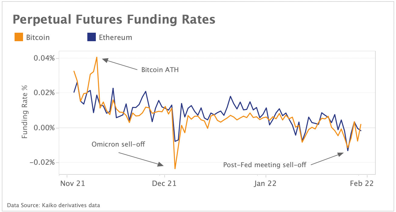 Die Marktstimmung ist weiterhin stark gedämpft, während die durchschnittlichen Finazierungsraten für BTC- und ETH-Futures im Januar mehrmals ins Minus rutschten. Die Finanzierungsraten sind die durchschnittlichen Kosten für das Halten einer Long-Position. Wenn sie negativ sind, bedeutet dies, dass die Preise für Perpetual Futures niedriger sind als der Indexpreis. Dies lässt darauf schliessen, dass mehr Händler Short-Positionen eingehen. Die Finanzierungsraten von Ethereum waren seit Ende November durchweg höher als die von Bitcoin.