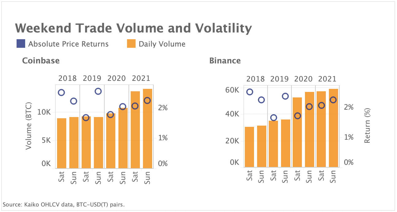 Oben sehen Sie das durchschnittliche tägliche Handelsvolumen an Wochenenden seit 2018 zusammen mit den absoluten Preisrenditen von BTC. Die Wochenendvolatilität hat zwischen 2020 und 2021 leicht zugenommen, ist aber seit 2018 insgesamt zurückgegangen. Die Wochenendhandelsvolumina stiegen auf Binance schneller an und verdoppelten sich in den letzten zwei Jahren fast, während die Volumina auf Coinbase langsamer stiegen. Dies könnte darauf zurückzuführen sein, dass Binance einen guten Ruf bei Privatanlegern hat, während viele institutionelle Anleger - die während der traditionellen Marktöffnungszeiten handeln - regulierte Fiat-Onramp-Börsen wie Coinbase bevorzugen.